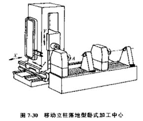 1)落地型(圖7-30)立柱作X、Z向運(yùn)動(dòng),主動(dòng)箱在立柱上作Y向運(yùn)動(dòng),可配備落地式工作臺及回轉(zhuǎn)工作臺。適用于大型零件(特別是較長的零件)或中型零件的多面多工序加工。