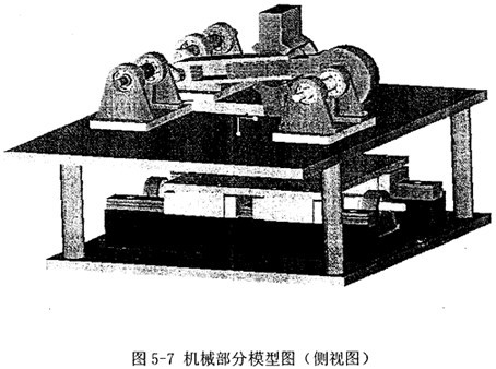 如圖5-1所示為實(shí)驗(yàn)系統(tǒng)機(jī)械部分的模型圖片,為了顯示清楚,沒(méi)有配置外邊的機(jī)箱,整個(gè)機(jī)構(gòu)是完全開(kāi)放式的,這樣也便于實(shí)驗(yàn)觀察。該機(jī)械結(jié)構(gòu)由上下兩個(gè)機(jī)架支撐,和前面的原理圖不同,下邊機(jī)架上放置昆旋導(dǎo)軌構(gòu)件(未顯示伺服電機(jī)),上邊機(jī)架則是上圖所示的其余連桿機(jī)構(gòu)及其支撐架、軸承等(未顯示常速電機(jī))。