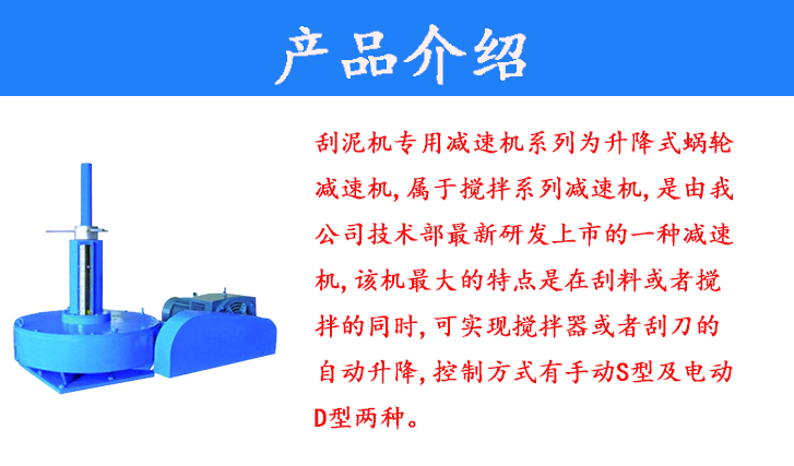 刮泥機專用減速機系列為升降式蝸輪減速機,屬于攪拌系列減速機,是由我公司技術(shù)部最新研發(fā)上市的一種減速機,該機最大的特點是在刮料或者攪拌的同時,可實現(xiàn)攪拌器或者刮刀的自動升降,控制方式有手動S型及電動D型兩種。