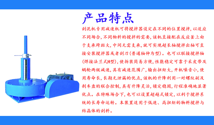 刮泥機專用減速機可將攪拌器設(shè)定在不同的位置攪拌,以適應(yīng)不同場合,不同物料的攪拌的需要,該機直接配在反應(yīng)釜上由于支承跨距大,中間無需支承,就可實現(xiàn)超長軸攪拌出軸可直接安裝攪拌器或者刮刀(普通軸伸為型)。也可以聯(lián)接攪拌軸(焊接法蘭式H型),使拆裝簡易方便,性能穩(wěn)定可靠于采皮帶及蝸輪兩級減速,具有減速范圍廣,輸出扭矩大,開機噪音小,使用壽命長,長期無泄漏的優(yōu)點,該機的升降利用一對螺紋副及剎車盤的聯(lián)合控制,具有升降靈活,鎖定穩(wěn)固,行程準(zhǔn)確地顯著優(yōu)點。在特殊場合下,也可以設(shè)置超越式鎖定,以利于攪拌系統(tǒng)的長壽命運轉(zhuǎn)。本裝置適用于低速、高扭矩的物料攪拌與結(jié)晶體的刮料。