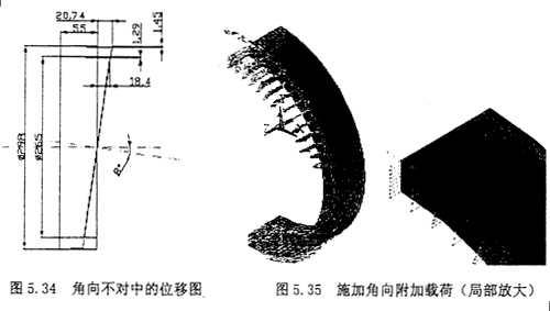 重復5.4.2節(jié)中的(1),(2),(3),(4),(5),(6)步驟。然后開始施加由于徑向的位移產生的附加剪應力。角向不對中時,由于兩軸之間存在一定的夾角,使得橡膠圓環(huán)最上方受到附加的拉應力,而圓環(huán)的最下端則受到附加的壓應力,這個附加的拉應力σang的大小和方問隨著圓環(huán)的旋轉角度改變而改變,在最上方時受拉,且絕對值最大,在最下方受壓,絕對值亦最大。而在平衡位置時則變成O。施加角向附加載荷后的圖形如5.35所示。