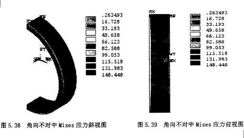 2.顯示節(jié)點的Von Mises應力云圖:選擇Main Menu>General Postproc>Plot Result>NodalSolu,在彈出的對話框內選擇“Stress”,第二欄內選擇“Von Mises Stress”,則其顯示的云圖如圖5,38,5.39所示