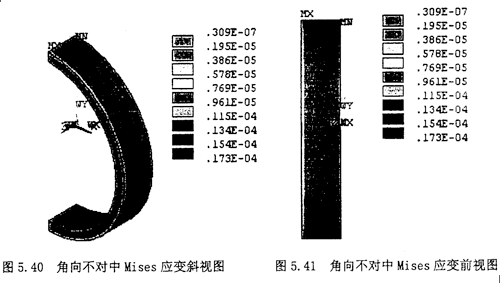 3.顯示節(jié)點的Von Mises應變云圖:選擇Main Menu>General Postproc>Plot Result>NodalSolu,在彈出的對話框內選擇“Strain”,第二欄內選擇“Von Mises Strain”,則其顯示的云圖如圖5.40,5.41所示