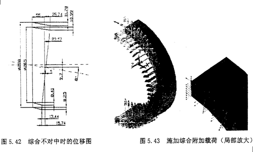 重復5.4.2節(jié)中的(1),(2),(3),(4),(5),(6)步驟。然后開始施加綜合的附加載荷。由于綜合位移使得橡膠圓環(huán)附加的徑向拉應力σax,附加的剪應力τrad,附加的角向應力τrad,以及由橡膠圓環(huán)旋轉扭矩產生的剪應力τrot。所以綜合不對中的應力情況應該是σax、τrad、τrad與τrot的疊加。施加綜合附加載荷后的圖形圖5.43所示。