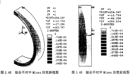 3.顯示節(jié)點的Von Mises應變云圖:選擇Main Menu>General Postproc>Plot Result>NodalSolu,在彈出的對話框內選擇“Strain”,第二欄內選擇“Von Mises Strain”,則其顯示的云圖如圖5.48,5.49所示