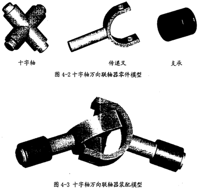 當(dāng)前,在工程領(lǐng)域,應(yīng)用美國(guó)PTC公司的CAD軟件Pro/E和美國(guó)MDI公司的動(dòng)力學(xué)仿真軟件ADAMS聯(lián)合進(jìn)行復(fù)雜機(jī)械系統(tǒng)的動(dòng)力學(xué)仿真研究是一種較實(shí)用、較流行的仿真方案。本文的仿真分析中所有模型均是采用這種方案?紤]到建模的注意因素,在用Pro/E建模的過程中,省去了十字軸萬(wàn)向聯(lián)軸器的許多細(xì)小結(jié)構(gòu),如潤(rùn)滑部分、滾針軸承、彈簧卡圈等,只是保留了十字軸萬(wàn)向聯(lián)軸器在原理上進(jìn)行傳動(dòng)的必需構(gòu)件和運(yùn)動(dòng)副。在此原則下建立的十字軸萬(wàn)向聯(lián)軸器的各構(gòu)件模型如圖4-2所示,實(shí)際上只包含十字軸和傳遞叉兩個(gè)活動(dòng)構(gòu)件。建立的十字軸萬(wàn)向聯(lián)軸器的裝配模型如圖4-3所示。