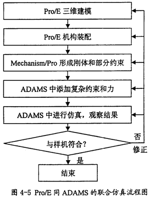 在仿真中如果發(fā)現(xiàn)結(jié)果不對(duì),則我們需要對(duì)前面的模型進(jìn)行修正,然后再做仿真分析,直到結(jié)果正確?偠灾肞ro/E和ADAMS進(jìn)行聯(lián)合仿真,其基本的步驟如圖4-5所示。