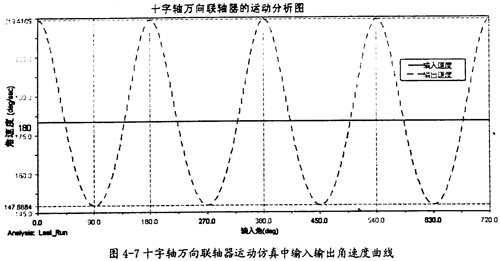 由圖4-6可知,仿真中十字軸萬(wàn)向聯(lián)軸器的兩軸夾角實(shí)際上即是34.88°(原夾角的補(bǔ)角),在第二章的十字軸萬(wàn)向聯(lián)軸器理論計(jì)算曲線圖中也包含了這個(gè)夾角下的運(yùn)動(dòng)分析曲線(圖2-12),比較圖2-12中β=34.88°的曲線和圖4-7的曲線,可知兩條曲線在變化頻率、形狀、值的大小都是一樣的。