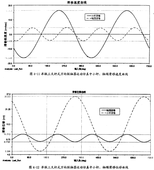 由圖4-12可以知道,在一定的夾角下,小桿在滑道中的滑移位移同小桿球面中心相對軸頸的滑移位移是不同的,前者(20.76mm)要遠大于后者(2.93mm),且它們變動的頻率也不一樣,在一個回轉(zhuǎn)周期中,前者步率是1次,而后者2次。此圖中的兩曲線同第三章中的理論分析曲線圖3-9、圖3-10是吻合的。這在一定的程度上也證明了三叉桿式萬向聯(lián)軸器理論分析中對小桿滑移位移和軸頸滑移位移這兩項計算的正確性。