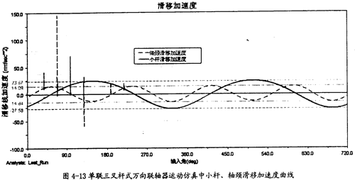 由圖4-13可以知道,在一定的夾角下,小桿在滑道中有滑移加速度同小桿球面中心相對軸頸的滑移加速度是不同的,前者要大于后者,且它們變動的頻率也不一樣,在一個回轉(zhuǎn)周期中,前頻率是1次,而后者2次。此圖中的兩曲線同第三章中的理論分析曲線圖3-13、圖3-14是吻合的,只是小桿滑移的加速度曲線在外形上有差異,仿真的曲線相當(dāng)?shù)钠交、?guī)則,但理論分析曲線卻不規(guī)則,這可能是在計算中簡化和省略的原因。盡管如下,這在一定的程度上也證明了三叉桿式萬向聯(lián)軸器理論分析中對小桿滑移加速度和軸頸滑移加速度這兩項計算的正確性。(值得說明的是此圖中曲線有時有突變的現(xiàn)象,主要是考慮到計算機的性能,計算中步長稍大的原故。在后面的分析曲線中也出現(xiàn)了這樣的情況,將不再作說明。)