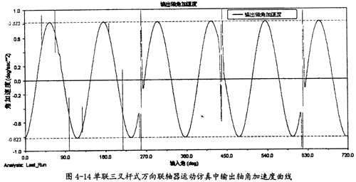 由圖4-9可以知道,當(dāng)輸入軸轉(zhuǎn)速恒定為90o/s時,輸出軸并不作恒速轉(zhuǎn)動,而是以90o/s為中心,作非常有規(guī)律的周期性運動,在每一個回轉(zhuǎn)周期中,它的變化頻率為3次。這里的結(jié)果同第三章中的曲線圖3-8也是完全吻合的,因此在一定的程度上也證明了三叉桿萬向聯(lián)軸器轉(zhuǎn)速分析理論的正確性。