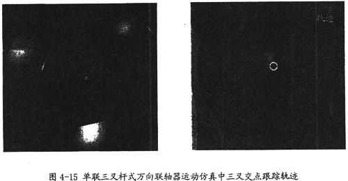 由圖4-15可以看出,在單聯(lián)三叉桿式萬向聯(lián)軸器的運動仿真中,三叉交點運動軌跡是一個圓,相對于半徑值R(此值的意義見第三章)它的半徑是相當(dāng)小的,這也解釋了為何運動中兩軸夾角在不斷作微小的變化,同時也證明了軸頭中心軌跡理論的正確性。