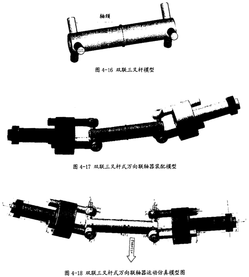 在本次分析中,建立的裝配模型是在第三章中圖3-2所示的模型的基礎(chǔ)上除去關(guān)節(jié)軸承,將三叉桿用圖4-16所示的雙聯(lián)三叉桿替換,在此模型的右端再加上同左端相同的結(jié)構(gòu),就得到雙聯(lián)三叉桿式萬向聯(lián)軸器的裝配模型。此模型如圖4-17所示。
