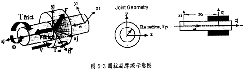圓柱副產(chǎn)生摩擦的示意圖5-3所示。在這種動(dòng)動(dòng)副中會(huì)產(chǎn)生逆向于移動(dòng)方向V(如圖5-3中藍(lán)色箭頭所示)的摩擦力Ffrict(如圖5-3中紅色箭頭所示)及逆向于旋轉(zhuǎn)方向ω(如圖5-3中藍(lán)色箭頭所示)的摩擦扭矩Tfnct(如圖5-3中紅色箭頭所示),它的產(chǎn)生主要由兩種因素,即構(gòu)件間相互作用的徑向力F、構(gòu)件間相互作用的彎矩Tm(這兩種力如圖5-3中綠色箭頭所示)。在施加這些作用力產(chǎn)生的摩擦力時(shí),要考慮徑向力F的大小、圓柱半徑RP(如圖5-3中間圖所示)、運(yùn)動(dòng)副間的重疊量和重疊量的變化情況、彎矩Tm的大小和彎矩的反作用臂長(zhǎng)Xs(如圖5-2中右圖所示),另外還得考慮靜摩擦系數(shù)、動(dòng)摩擦系數(shù)及預(yù)載荷的作用。
