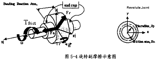 旋轉(zhuǎn)副產(chǎn)生摩擦的示意圖如圖5-4所示。在這種運(yùn)動(dòng)副中只會(huì)產(chǎn)生逆向于旋轉(zhuǎn)方向ω(如圖5-4中藍(lán)色箭頭所示)的摩擦扭矩Tfrict(如圖5-4中紅色箭頭所示),它的產(chǎn)生主要由三種因素,即構(gòu)件間相互作用的徑向力Fr、構(gòu)件間相互作用的軸向力Fa、構(gòu)件間相互作用的彎矩Tr(這三種力如圖5-4中綠色箭頭所示)。在施加由這些作用力產(chǎn)生的摩擦力時(shí),要考慮徑向力Fr的大小、圓柱半徑RP(如圖5-4右圖所示)、軸向力Fα的大小、摩擦半徑Rn的大。ㄈ鐖D5-4右圖所示)、彎矩Tm的大小和彎矩的反作用臂長(zhǎng)(即旋轉(zhuǎn)副的長(zhǎng)度,如圖5-4中左圖所示),另外還得考慮靜摩擦系、動(dòng)摩擦系數(shù)及預(yù)載荷的作用。