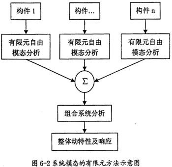 通過對(duì)系統(tǒng)中的各構(gòu)件進(jìn)行有限元自由模態(tài)分析,得到各構(gòu)件的自由模態(tài)(當(dāng)然也包含了6個(gè)剛體模態(tài)),以各構(gòu)件的連接關(guān)系為依據(jù),建立邊界條件,然后進(jìn)行模態(tài)綜合,即可計(jì)算得到整個(gè)系統(tǒng)的動(dòng)特性和響應(yīng)。其過程如圖6-2。