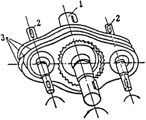 三環(huán)減速器是一種利用三相并列雙曲柄機(jī)構(gòu)來克服死點(diǎn)的連桿內(nèi)齒行星齒輪減速器,其基本結(jié)構(gòu)如圖5-0所示。它由低速輸出軸1 ,兩根高速輸入軸2 ,三片傳動齒板3組成,各軸均平行配置,相同的兩根高速軸帶動三片傳動齒板呈120°相位差作平面轉(zhuǎn)動,傳動環(huán)板上的內(nèi)齒圈與低速軸上的外齒輪相嚙合,形成大速比,其傳動比