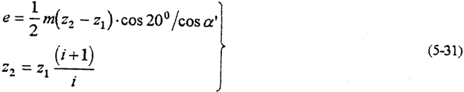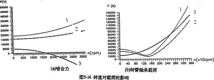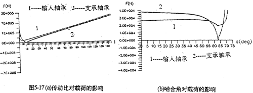 由上式知,當(dāng)齒數(shù)差Z2-Z1越小或傳動(dòng)比i越大時(shí),偏心距e越;壓力角越大時(shí),偏心距e越大,則選用的行星軸承尺寸大,齒板高速軸承孔徑也就大。圖5-17是傳動(dòng)比、壓力角、以減速器行星軸承載荷的影響。由圖可見(jiàn),傳動(dòng)比的變化對(duì)減速器的動(dòng)力性能影響極大;傳動(dòng)比越大,則偏心距越小。由式(5-30)分析得,行星軸承載荷必須大。壓力角的變化,對(duì)行星軸承載荷影響小得多。