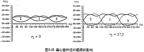 圖5-18是偏心套外徑對(duì)嚙合圖的影響。當(dāng)不考慮偏心套外徑(r2=0)時(shí),嚙合力分布為正值。考慮偏心套外徑(r2=37.5mm)計(jì)算結(jié)果,出現(xiàn)負(fù)向嚙合力。而且其幅值明顯增大。輸入扭矩也不再是固定值。因此,對(duì)三環(huán)減速器進(jìn)行動(dòng)力計(jì)算,必須考慮r2的影響。此外,行星軸承內(nèi)外圈接觸承載位置,也影響三環(huán)減速器的動(dòng)力性能。