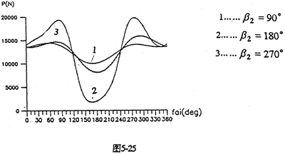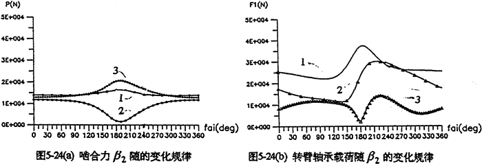 當(dāng)輸入軸與軸出軸的中心距確定后,可通過(guò)調(diào)整支承軸的位置,滿足特殊的空間位置要求,或者設(shè)計(jì)成載荷分布特性最優(yōu)、幅值最小的減速器。圖5-24是中心距L1=400mm、L2=200mm時(shí),支承軸相對(duì)于輸出軸轉(zhuǎn)動(dòng)的角位移β2變化時(shí)嚙合力及行星軸承載荷的分布情況。由圖看出,各種載荷均在180°附近(SHQ偏置式減速器)取得極大值。在0°~90°和270°~360°范圍(Ⅰ、Ⅳ限內(nèi)),三相齒板嚙合力分配很均衡,嚙合沖擊很小。因此。設(shè)計(jì)三環(huán)減速器時(shí),為減小載荷的幅值和各相之間載荷的差值、支承軸應(yīng)盡可能遠(yuǎn)離180°,即不采用三軸心共線的水平位置的結(jié)構(gòu)。圖5-25為幾個(gè)特殊位置的嚙合力隨轉(zhuǎn)角變化的分布規(guī)律。