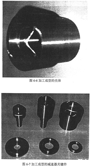 為保證空間正弦滾道的加工精度,工件經(jīng)過車削、銑削及高頻淬火等工藝流程后,必須對空間正弦滾道進行精磨。對內(nèi)空間正弦滾道的磨削是比較困難的工藝流程,本文根據(jù)滾道及殼體內(nèi)圓柱面的形狀尺寸,進行了非標球頭磨具的設計。該非標球頭磨具的材質(zhì)選用金屬基立方氮化硼(CBN),CBN濃度為100%,粒度為80目。其制造的工藝流程為:將立方氮化硼顆粒溶入液化的金屬基(銅)中,澆注在特定的模具中,冷卻凝固后,將金屬基CBN球頭與鋼質(zhì)刀柄用銀焊接在一起,最后采用電火花工藝將球頭按一定精度加工成型,由此更好的保證了球頭磨具的型位公差。為防止磨削時產(chǎn)生的積屑降低磨具的磨削硬度及精度,在磨具的球頭部位還設計有排屑槽。加工成型后的金屬基CBN球頭磨具見圖6-3。最終加工成型的主動軸、導架、殼體、其它關鍵件及裝配后的減速器樣機見圖6-4~圖6-8。