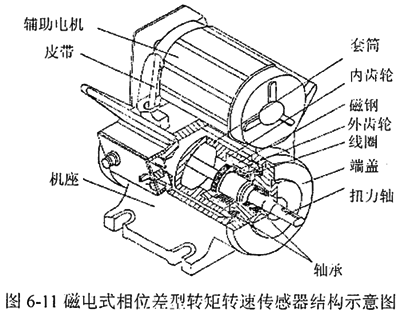 圖6-11為磁電式相位差型轉矩轉速傳感器的結構示意圖,它由機座、端蓋、扭力軸、內(nèi)齒輪、外齒輪、磁鋼、線圈軸承等組成。內(nèi)齒輪、磁鋼固定在套筒上,線圈固定在端蓋上,外齒輪固定在扭力軸上,當內(nèi)外齒輪發(fā)生相對轉動時,由于磁通不斷變化,在線圈中便感應出近似正弦波的感應電勢ul、u2,兩感應電勢的初始相位差是恒定的,考慮到正反加載,φ0設計在大約180°位置上,當加上扭力時,扭力軸發(fā)生扭轉變形,在彈性范圍內(nèi)外加扭矩與機械扭轉角成正比,這時ul、u2訊號的相位差要發(fā)生變化,即