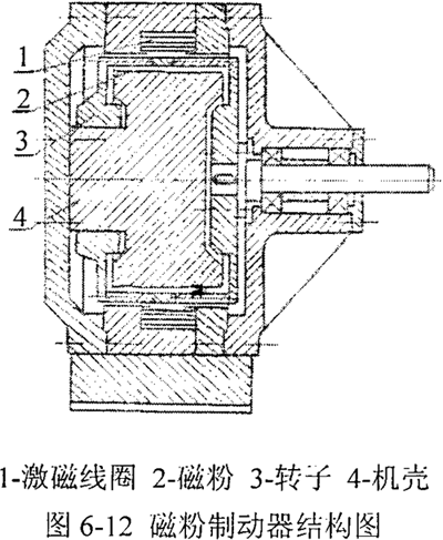 采用磁粉制動器作為試驗的加載裝置。磁粉制動器由轉子、機殼、激磁線圈、磁粉組成,其結構如圖6-12所示。在激磁線圈不通電流時,不產(chǎn)生磁通,磁粉呈自由狀態(tài)。當軸轉動時,由于離心力的作用,使磁粉散布在轉動件與機殼之間,若此時激磁線圈通電流,則在線圈周圍產(chǎn)生磁場,轉動件與機殼間的磁粉沿磁通方向連接成鏈狀,由于磁粉間的結合力,使工作面之間產(chǎn)生摩擦力,從而形成制動力矩,起到加載的作用。該力矩與激磁電流的大小基本成正比,故通過調(diào)節(jié)激磁線圈的電流大小可在一定范圍內(nèi)改變制動力矩的大小。