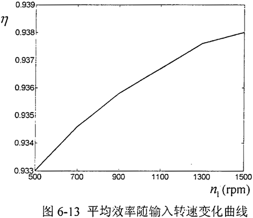 同樣方式測得當輸入轉速分別為700rpm、900 rpm、1100 rpm、1300 rpm、1500 rpm時,減速呂樣機的平均效率隨輸入轉速變化曲線如圖6-13。通過測試結果表明,在低中速情況下,減速器的傳動效率受其轉速的影響不明顯,由于此時潤滑脂溫度較低,隨著轉速的增加,減速器的傳動效率略有提高,其平均值在93%以上,由引說明本文設計的減速器具有較高的傳動效率。