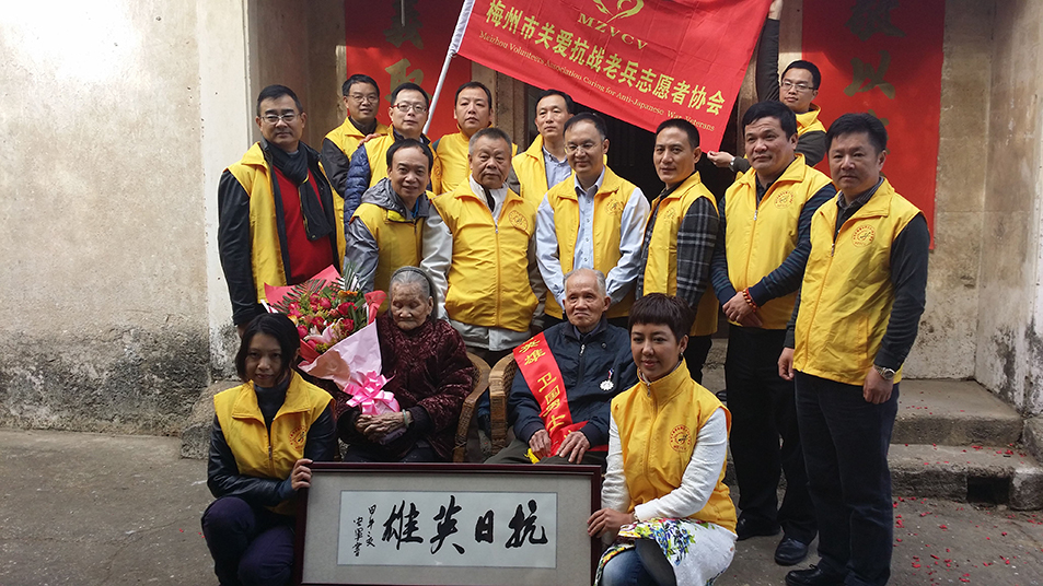 梅州市關(guān)愛抗戰(zhàn)老兵志愿者協(xié)會(huì)成立后,大力開展尋訪散居梅州山鄉(xiāng)的抗戰(zhàn)老兵,為尋訪到的每位抗戰(zhàn)老兵舉行民間簡樸又莊重的“贈(zèng)章授榮”儀式、為困難老兵提供基本生活保障、為抗戰(zhàn)老兵提供日常生活照顧、為老兵過生日、重大節(jié)日慰問、生病看望看護(hù)、為抗戰(zhàn)老兵留影留聲、留手印,歸隊(duì)致以哀榮等等關(guān)愛活動(dòng),以熱心和誠心,為抗戰(zhàn)老兵送去“遲到的榮譽(yù)”和慰藉。經(jīng)協(xié)會(huì)理事會(huì)研究,決定對抗戰(zhàn)老兵進(jìn)行日常關(guān)愛的同時(shí),給幸存抗戰(zhàn)老兵每月500元的致敬金。通過發(fā)放關(guān)愛金和致敬金,使老兵每月能獲得1100元的生活保障。2014年9月至2018年5月,廣東省雁洋公益基金會(huì)發(fā)放葉劍英基金關(guān)愛金380多萬元,協(xié)會(huì)動(dòng)員社會(huì)各界熱心人士和志愿者38600多人次,行程逾10萬公里,為抗戰(zhàn)老兵發(fā)放致敬金及其它慰問金等700多萬元,為抗戰(zhàn)老兵發(fā)放御寒物資一大批、保健品和日常生活用品、慰問品一大批,為住院就醫(yī)的抗戰(zhàn)老兵送上慰問金和輪值守護(hù)陪伴,累計(jì)為300多位梅州抗戰(zhàn)老兵及老兵遺孀,廣東以外800多位抗戰(zhàn)老兵及老兵遺孀送上了最真摯的關(guān)懷。
